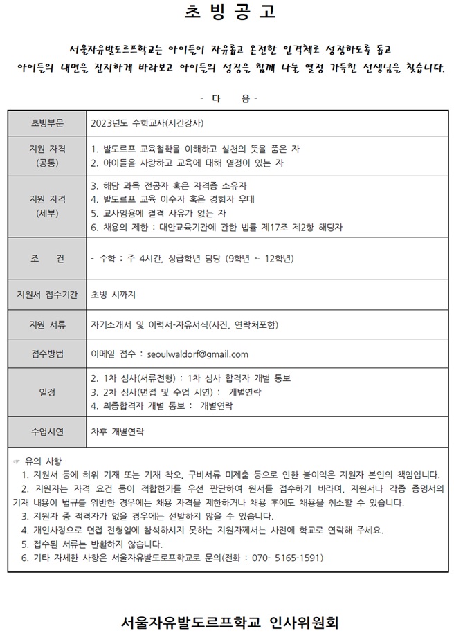 서울자유발도르프학교에서 상급수학교사(전임)를 초빙합니다.