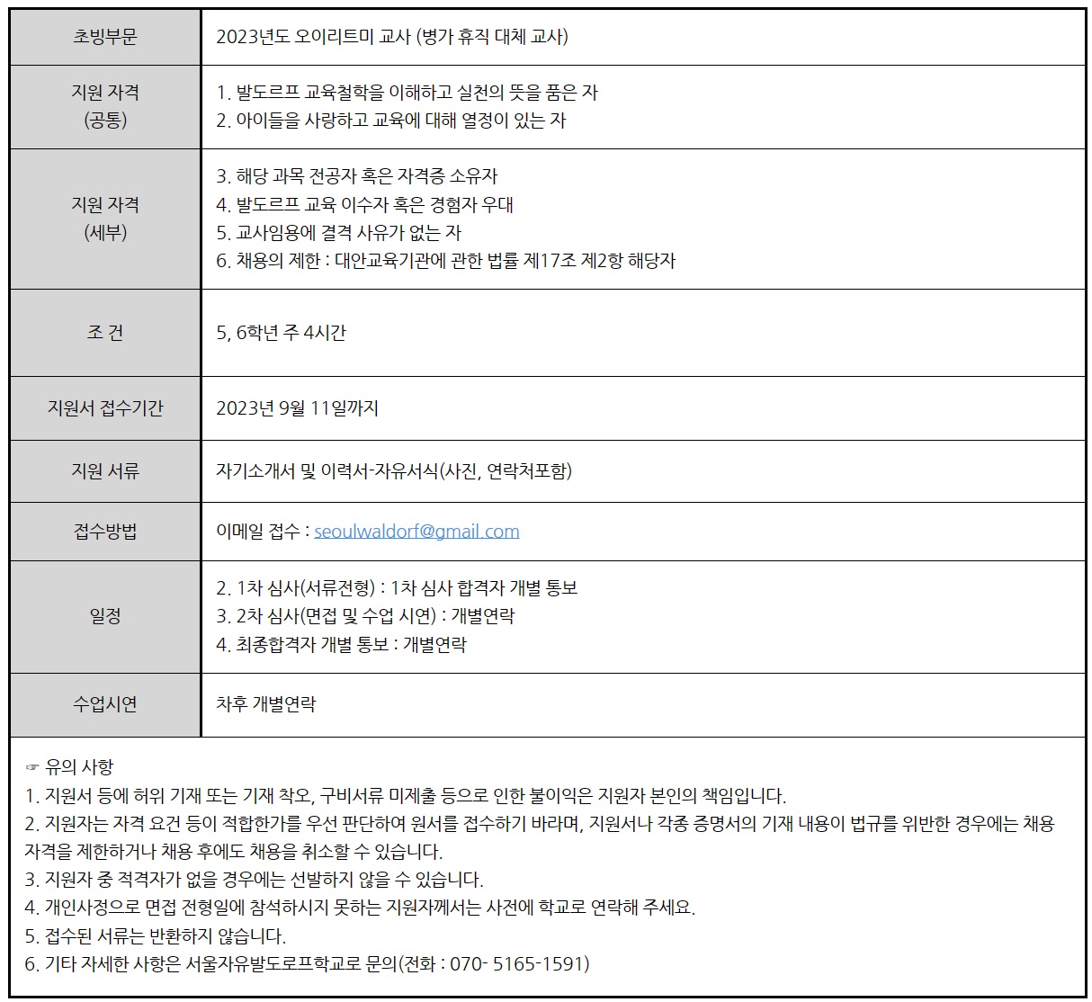 서울자유발도르프학교에서 오이리트미 교사를 초빙합니다.
