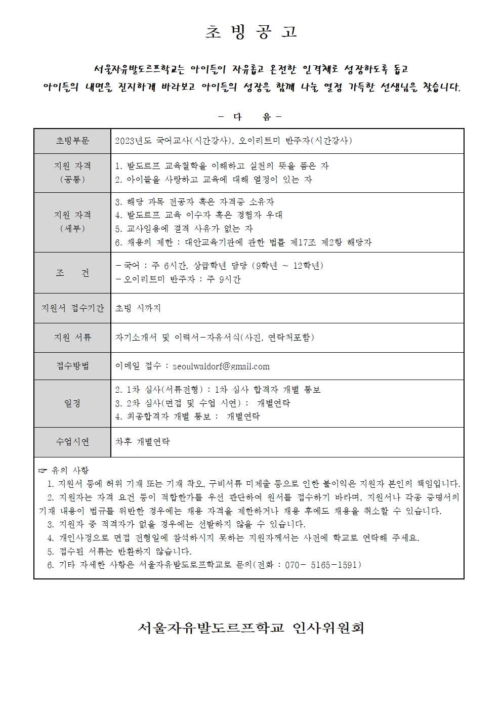 [초빙]서울자유발도르프학교에서 국어교사, 오이리트미 반주자를 초빙합니다.
