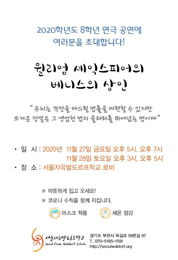 * 코로나 상황의 수칙을 지키기 위해, 우리학교 식구들만 모시게 됨을 양해해 주십시오. 더불어 4회 공연 모두를 관람하는 것을 지양하고 서로 조금 양보해 주시면 코로나 수칙을 지키며 더 많은 분들이 관람할 수 있겠습니다!