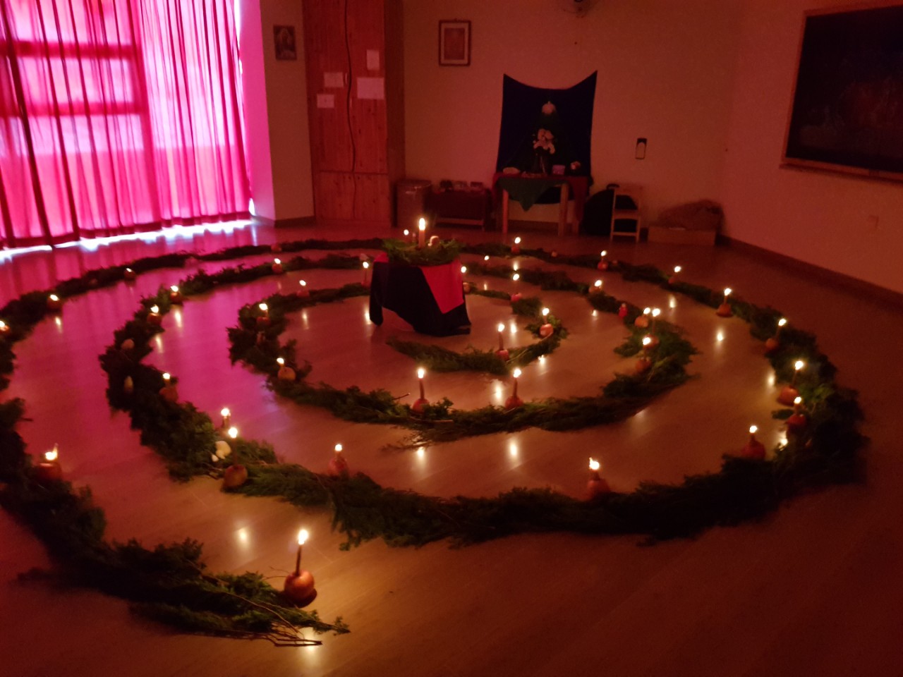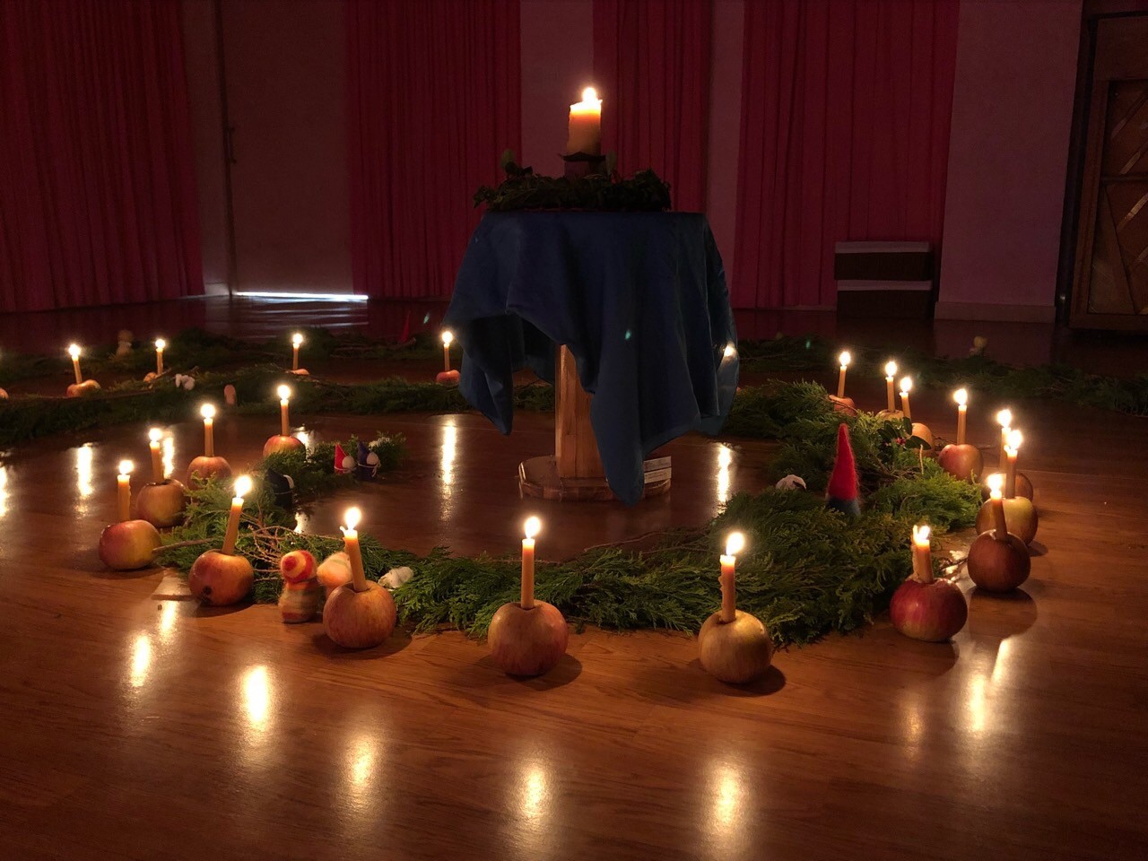 정원 한 가운데 천사의 빛을 받은 사과초에 불을 밝힙니다.