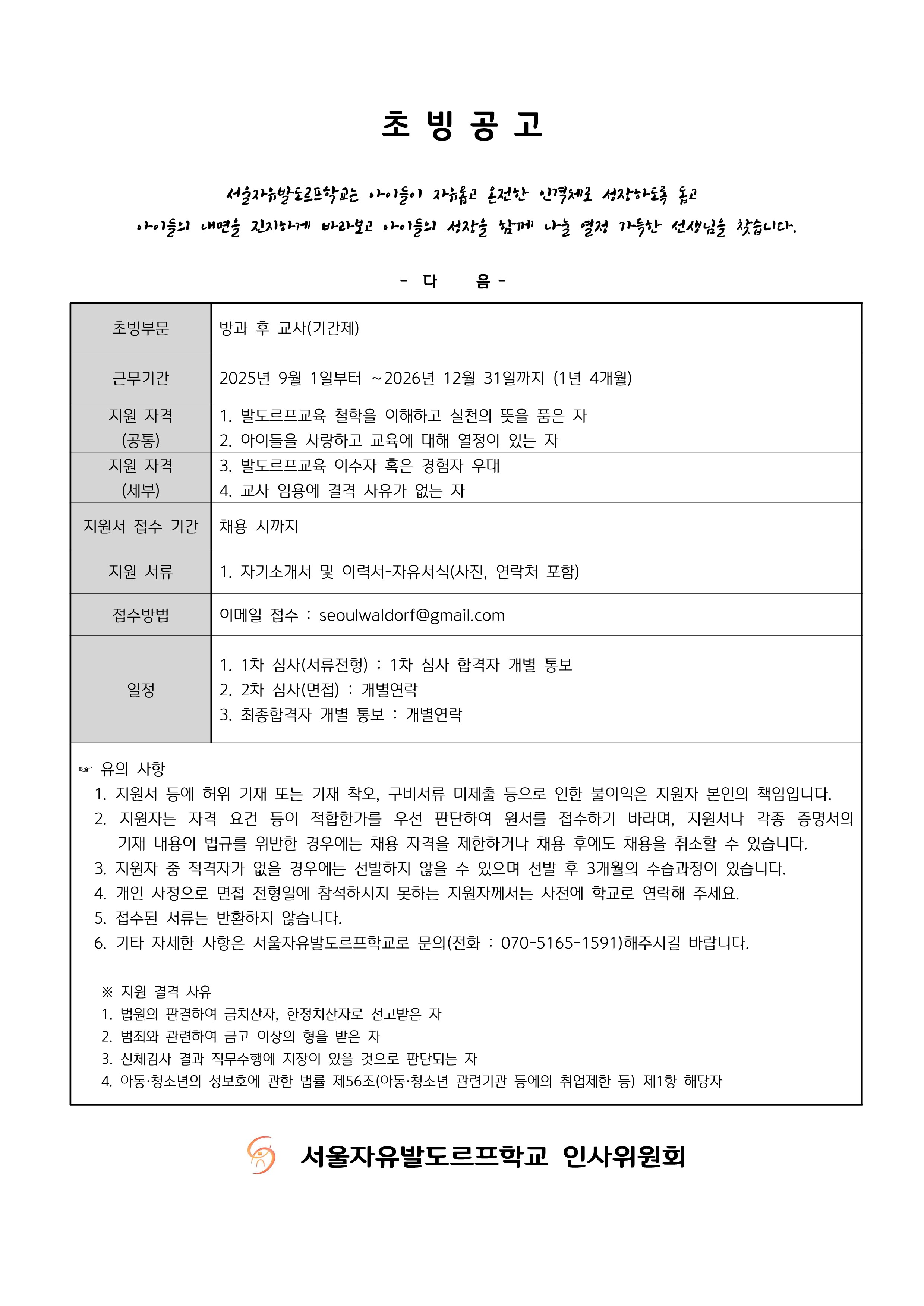 서울자유발도르프학교에서 방과후교사(기간제)를 초빙합니다.