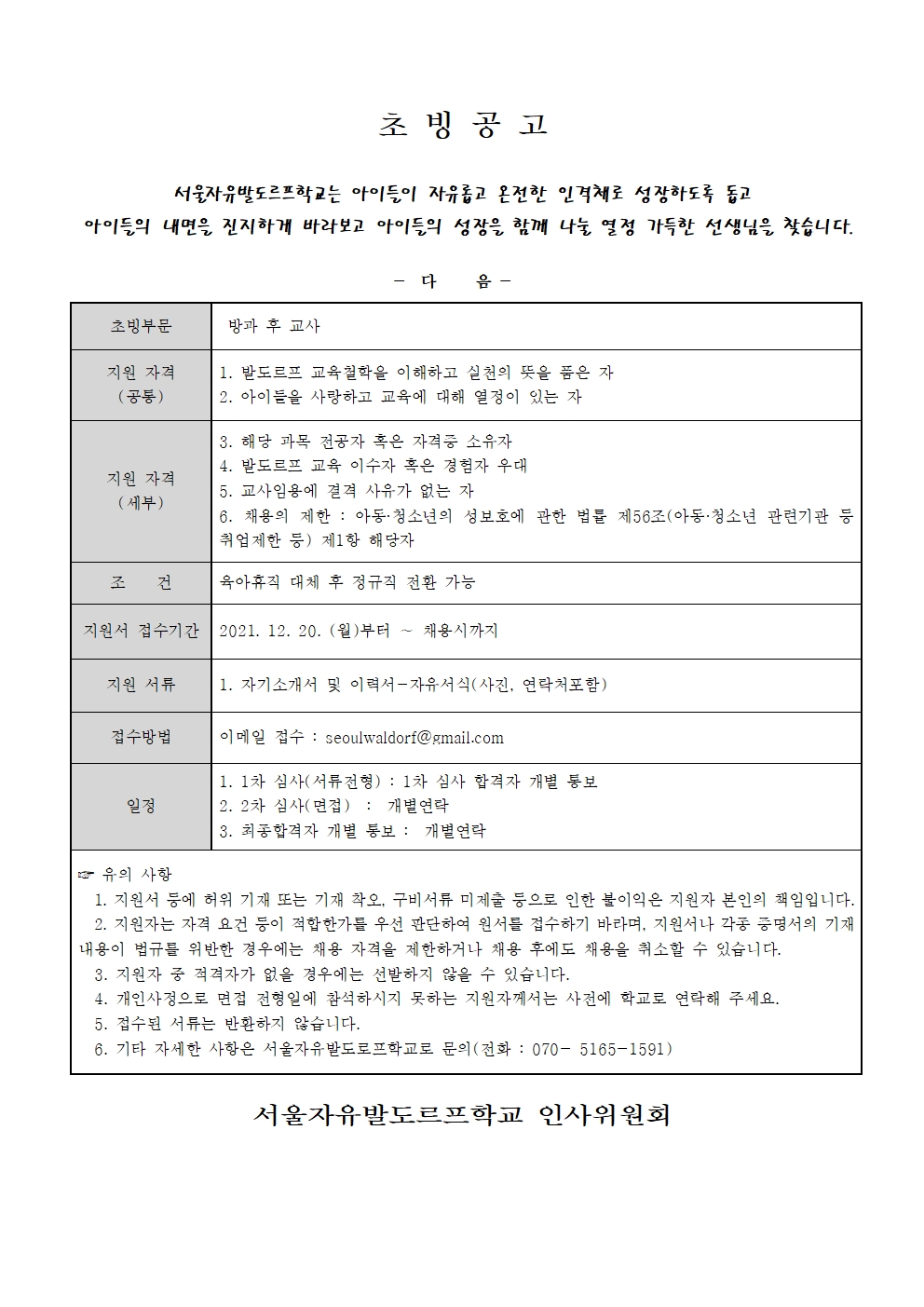 서울자유발도르프학교에서 방과후교사를 초빙합니다.