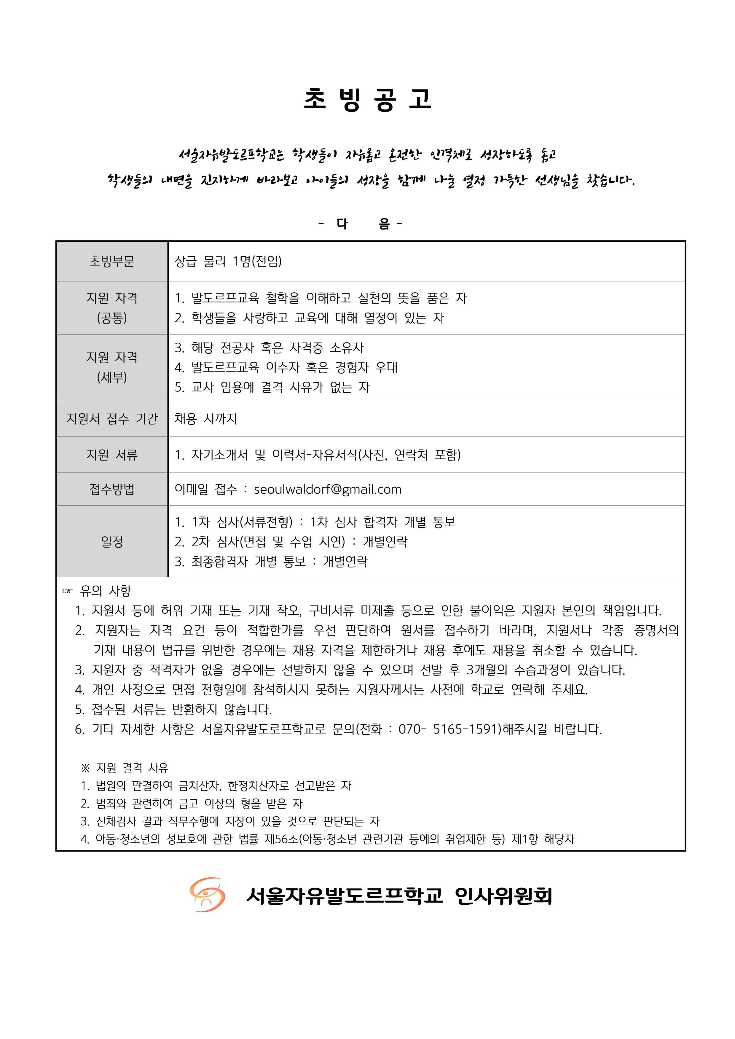 서울자유발도르프학교에서 2026년 1학년 담임교사를 초빙합니다.