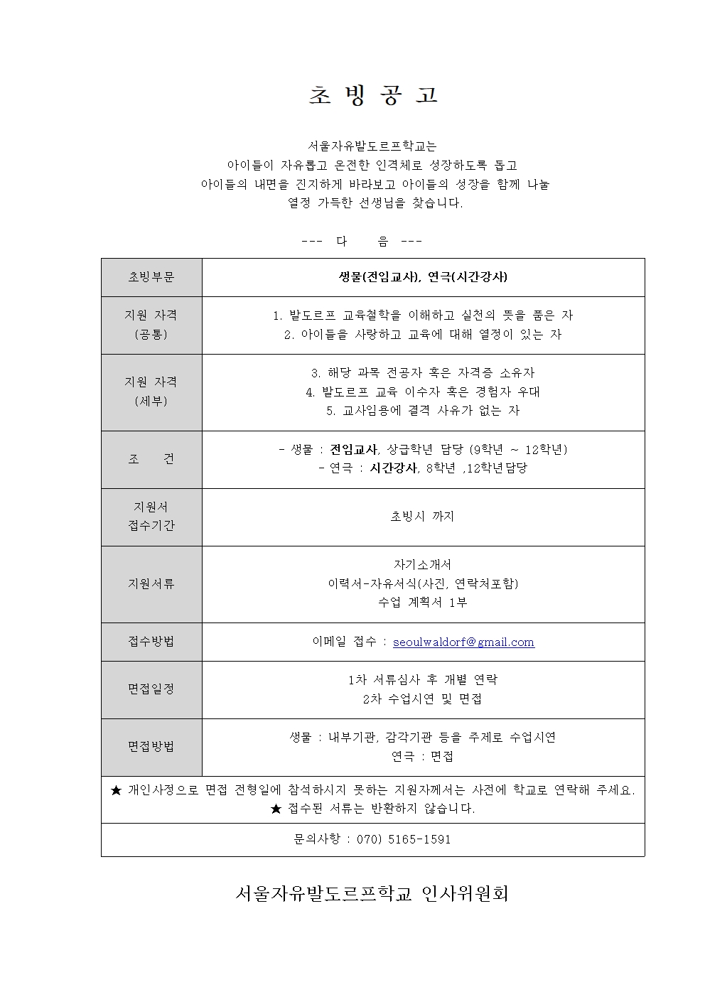 서울자유발도르프학교에서 생물, 연극 선생님을 초빙합니다.