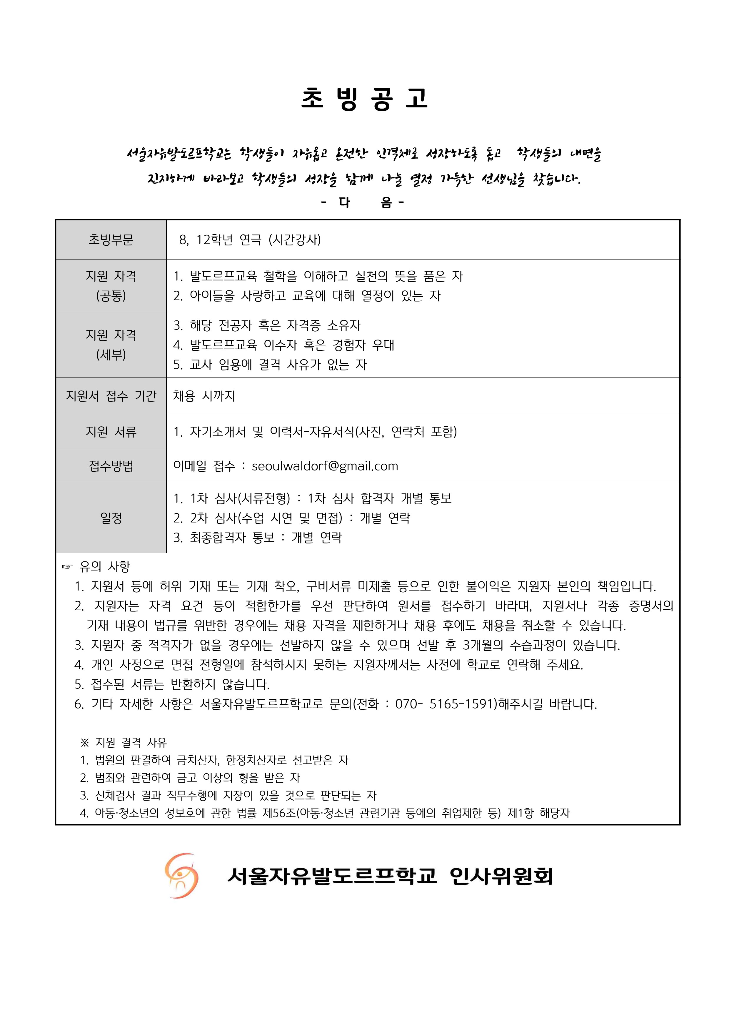 서울자유발도르프학교에서 연극교사(시간강사)를 초빙합니다.