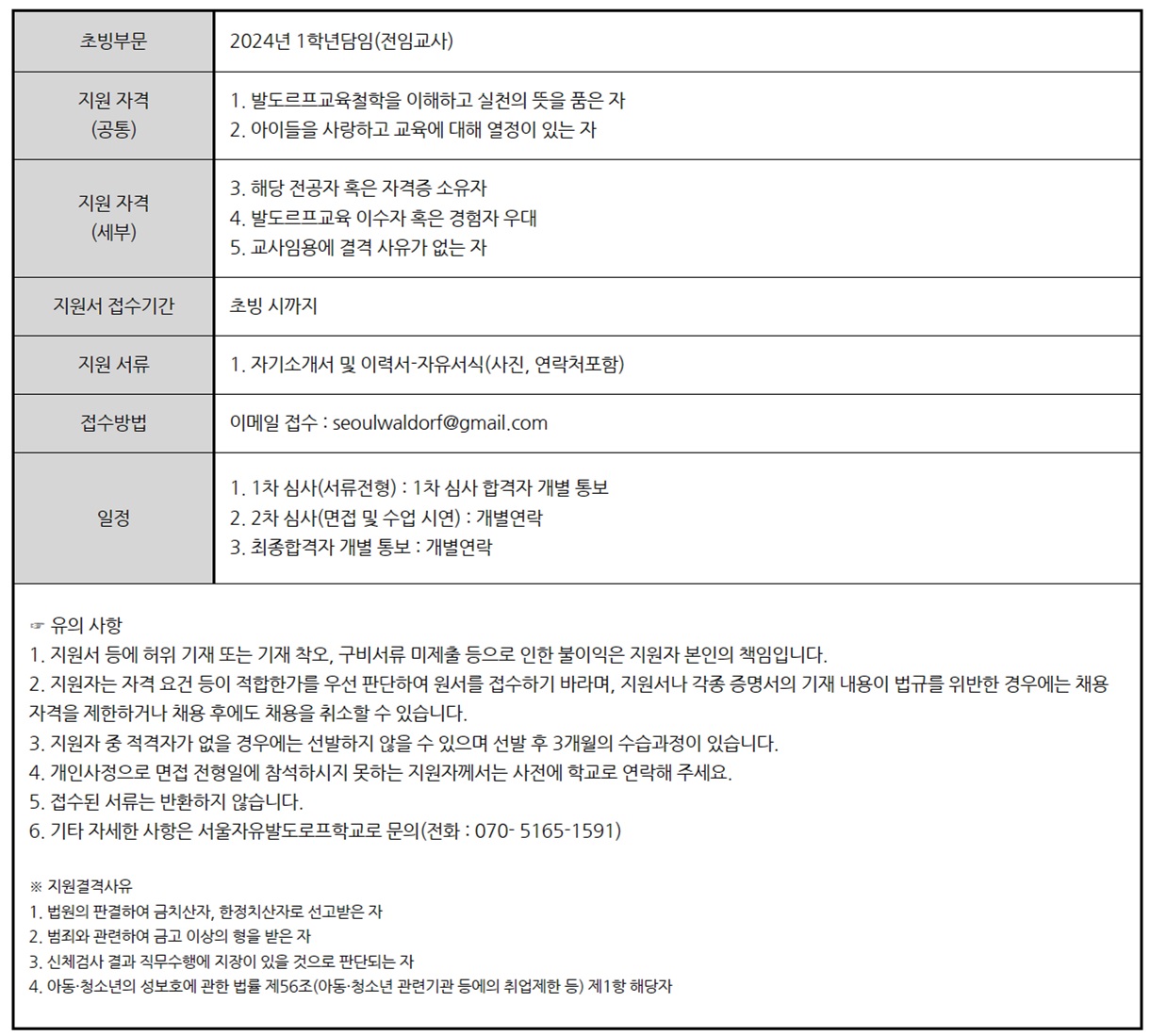 서울자유발도르프학교에서 2024년도 1학년 담임 선생님을 초빙합니다.