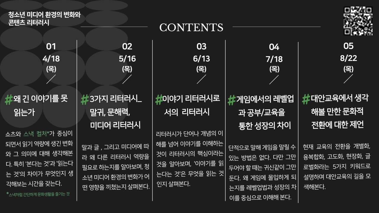 엄기호 선생님과 함께 "청소년 미디어 환경의 변화와 콘텐츠 리터러시"라는 주제로 총 5회차에 걸쳐 교육특강이 진행됩니다.