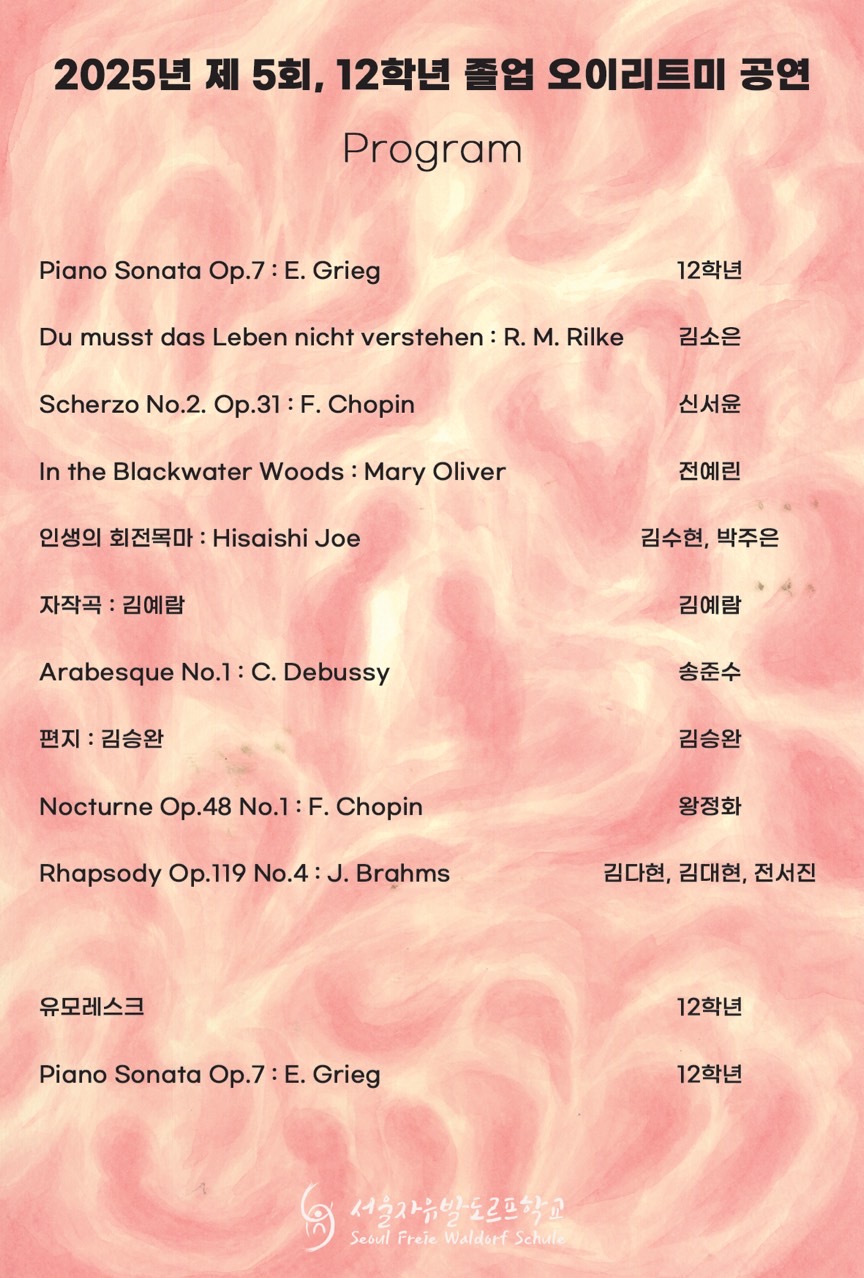 2025학년도 12학년 졸업 오이리트미 공연 안녕하세요, 12학년입니다! 2025 제5회 서울자유발도르프학교 12학년 졸업 오이리트미 공연 [시나브로; 어울림]에 여러분을 초대합니다. ‘시나브로; 어울림’은 점차 변화하며 서로의 색이 스며들어 하나가 되어가는 과정을 의미합니다. 졸업을 앞둔 지금, 무대 위에서 12개의 색이 시나브로 어우러져 하나의 빛으로 번져가는 모습을 함께 지켜봐 주세요!